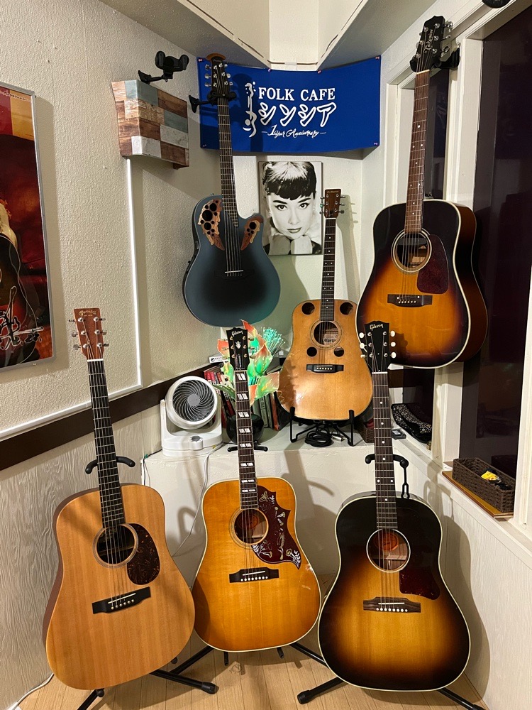 「Acoustic FOLK CAFE シンシア」 アコースティックギターの魅力を味わえるお店です。飛び入り演奏も大歓迎!です。。。 ギター(Gibson Humming bird、Gibson J-45、Marthin、Ovation、Takamine)はどれでも弾けます。 週末は込み合って入店をお断りする場合もありますので、来店する際には電話でお問い合わせ下さい。 ☎ 090-8367-9392 【お願い】 ※用務員(ギター奏者)の都合により、ギター演奏及びギター伴奏ができない場合があります。 ※アコースティックギター以外の楽器の持ち込みはご遠慮くださいますようよろしくお願いいたします。 ※了解を得ずにギターを演奏すること、泥酔者のギター演奏はお断りします。ステージ以外でのギター演奏については状況次第ではお断りする場合もあります。 ※他のお客さんの迷惑となりますので、明らかに泥酔していると見受けられる方の入店をお断りします。また、泥酔された方のギター演奏についてもお断りします。 ※予約をされた方は、予約時間の10分前には来店ください。予約時間を過ぎますとキャンセルとなる場合がございますのでご了承願います。 |